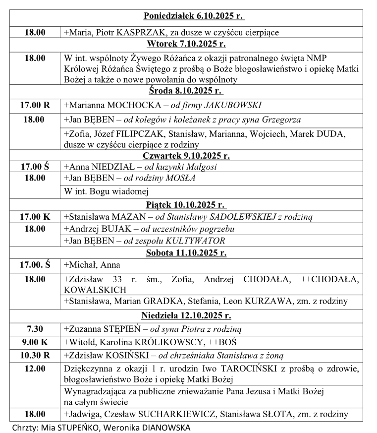 Intencje mszalne 06.10 – 12.10.2025r.