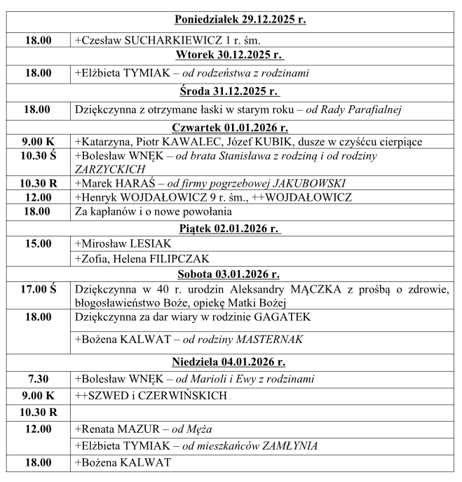 Intencje mszalne 29.12.2025 – 04.01.2026r.