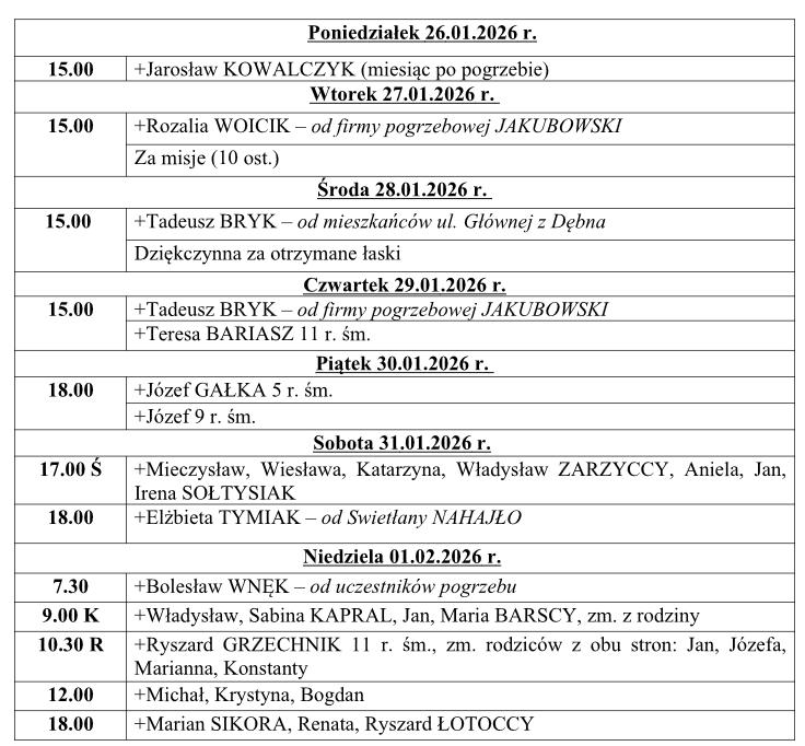 Intencje mszalne 26.01 – 01.02.2026r.