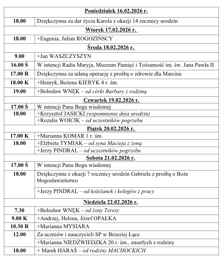 Intencje mszalne 16.02 – 22.02.2026r.