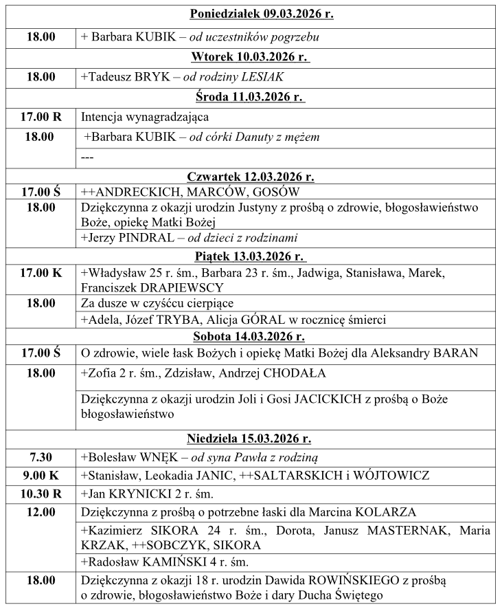 Intencje mszalne 09.03 – 15.03.2026r.